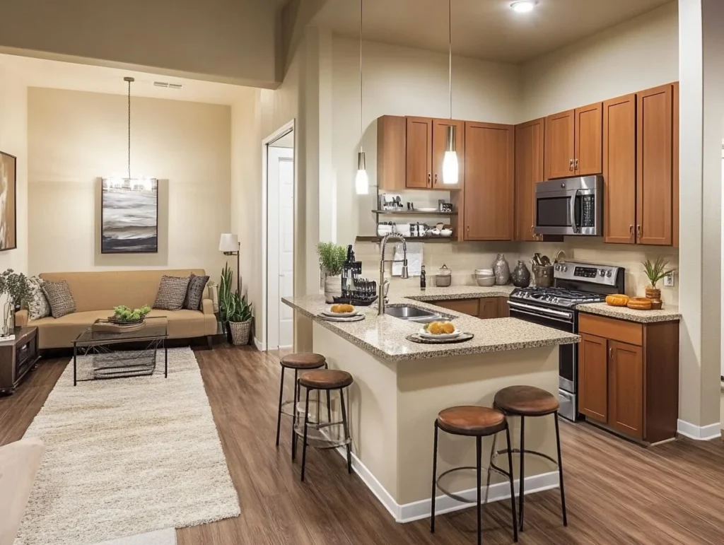 Prompt de Midjourney: Un entorno de apartamento compacto donde la cocina y la sala de estar se integran perfectamente, con una pequeña isla con taburetes, una acogedora área de descanso y decoración coordinada en todo el espacio. La imagen debe capturar toda la habitación, mostrando la conexión fluida entre las dos áreas.