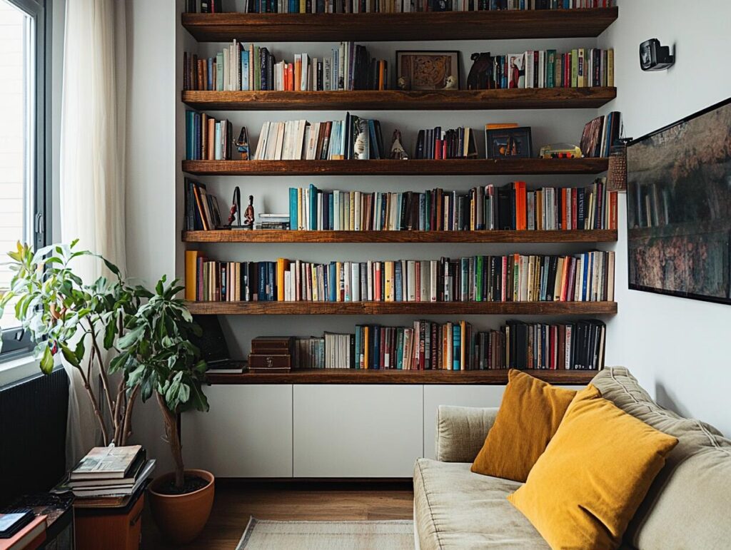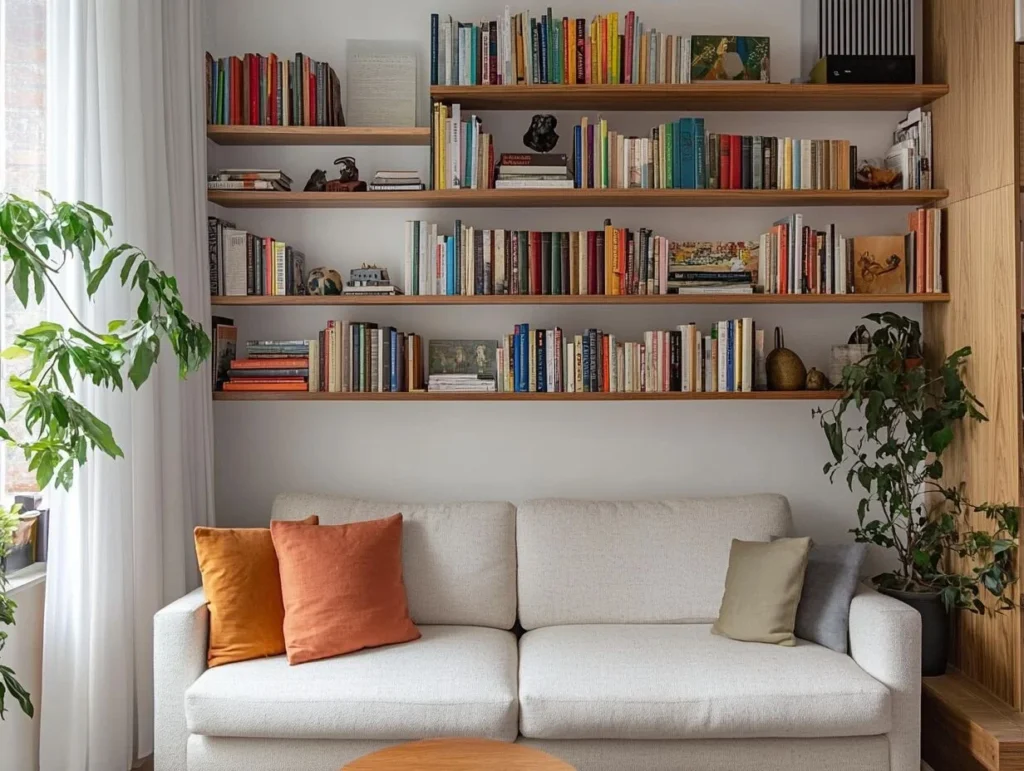 Prompt de Midjourney: Un apartamento pequeño con estanterías altas que llegan hasta el techo, utilizadas para almacenar libros, plantas y objetos decorativos, maximizando el espacio vertical y manteniendo el suelo despejado.