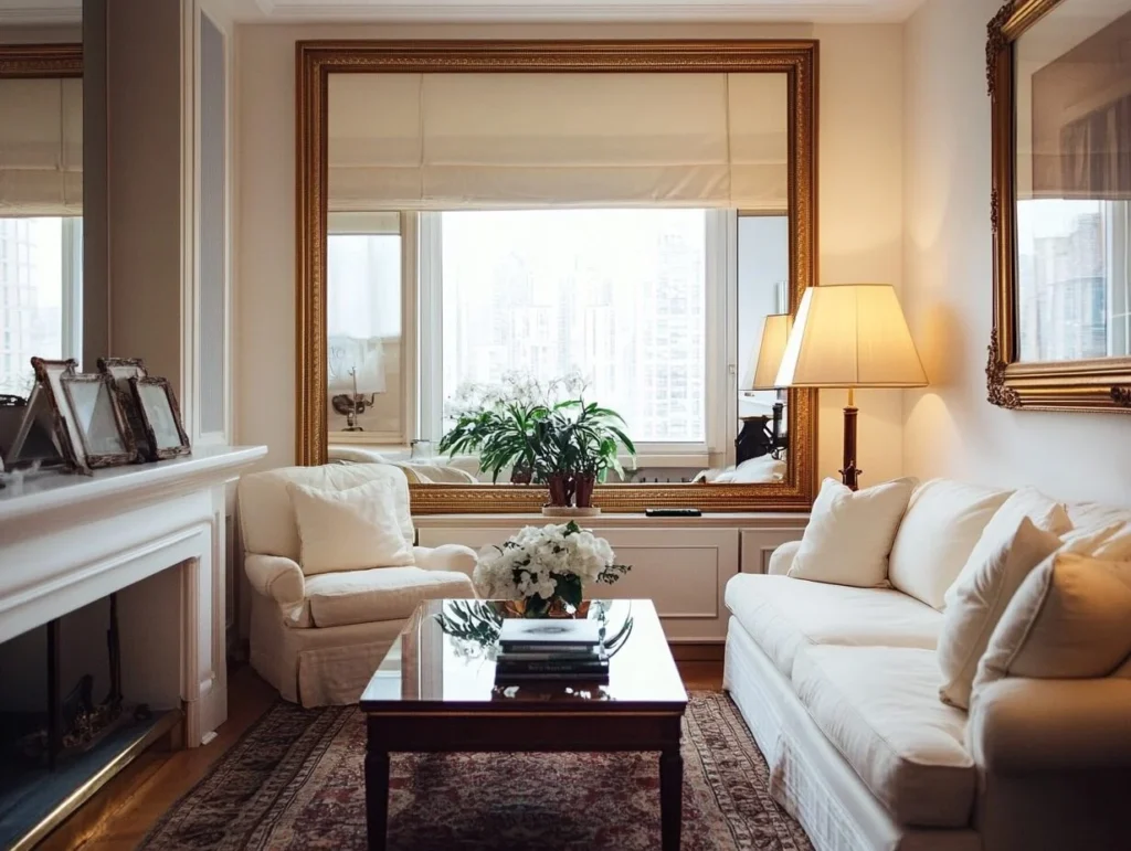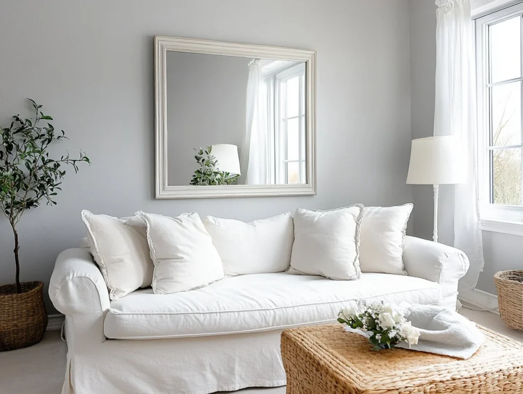 Prompt de Midjourney: Una sala de estar pequeña con paredes gris claro, un sofá blanco mullido y un gran espejo colgado frente a una ventana, aumentando efectivamente la luz y el espacio percibido. La habitación completa es visible para mostrar cómo el color y la decoración abren el espacio.